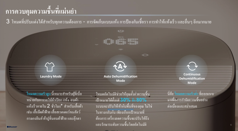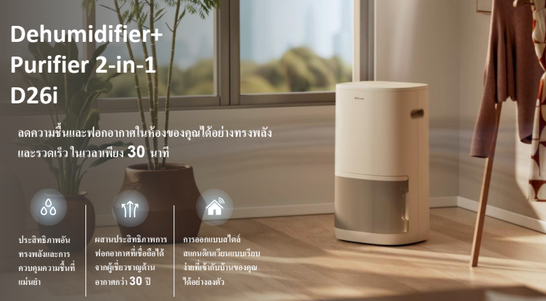 - 2 in 1 มอบอากาศที่สะอาดกว่า และลดความชื้นที่เหมาะสม ในเครื่องเดียว ด้วยประสิทธิภาพอันทรงพลัง แม่นยำและรวดเร็ว ในเวลาเพียง 30 นาที(จากความชื้น 80% เหลือ 50%)
