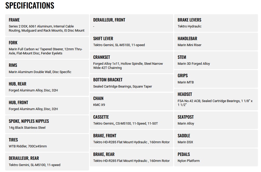 Hopping up to a higher-spec Series 3 aluminum frame and a carbon fibre fork, the DSX 1 is lighter and slightly stiffer than the base model bike. There’s also an 11-speed 1X Tektro drivetrain, WTB Riddler tires, Tektro hydraulic brakes and plenty of reliable Marin components.