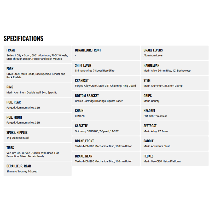 Our Series 1 aluminum frame is lightweight and responsive, and comes decked out with plenty of rack and fender mounts to suit your setup. There’s a Shimano 7-speed drivetrain, Vee Tire tires, Clark’s mechanical disc brakes and plenty of reliable Marin components.